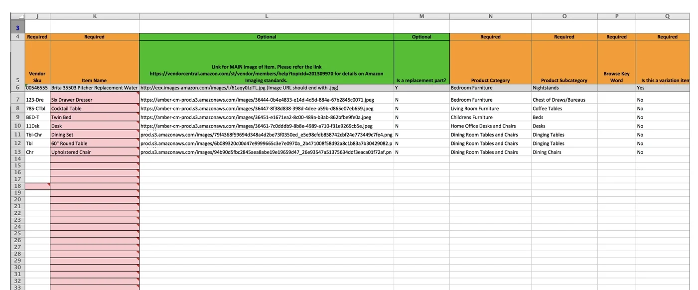An example of an Excel export needed to sell on certain e-tailer sites. The Amber Engine tool takes the retailer's digital data and creates the Excel sheet for them, reducing manual data entry time and errors.